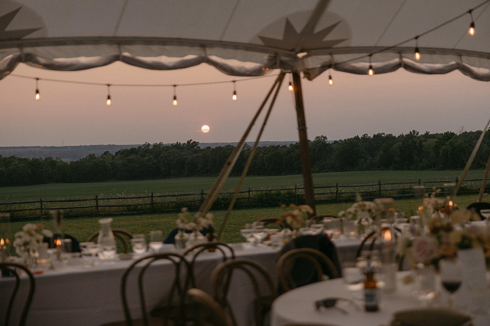 The tent sits on a beautiful field that overlooks the hills leading down to Seneca lake. You get the perfect sunset views and lighting. So many of our guests took such nice pictures they look professional!